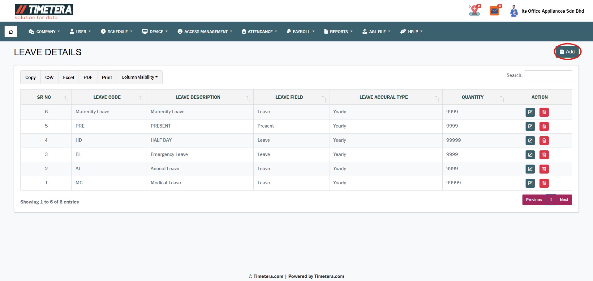 To add a leave type, click the Add button.