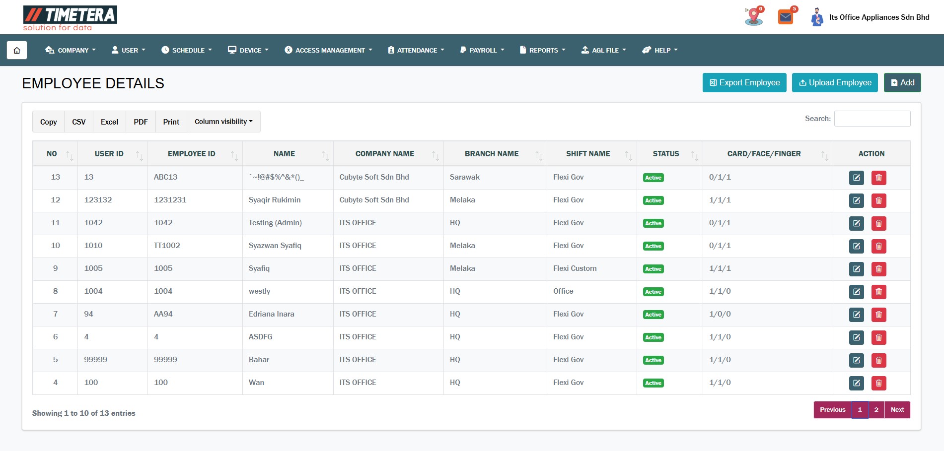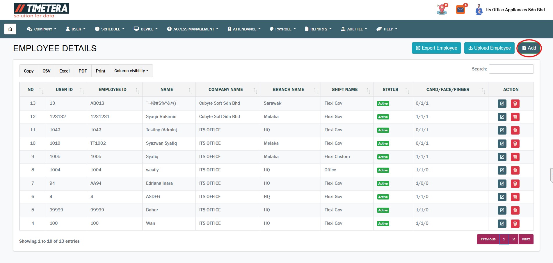 From the main menu, navigate to USER → USER MANAGEMENT → EMPLOYEE. This will take you to the User Page, where you can view a complete list of all users within your company.